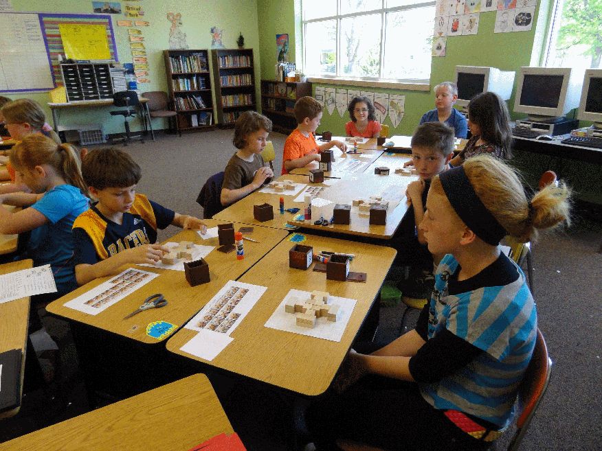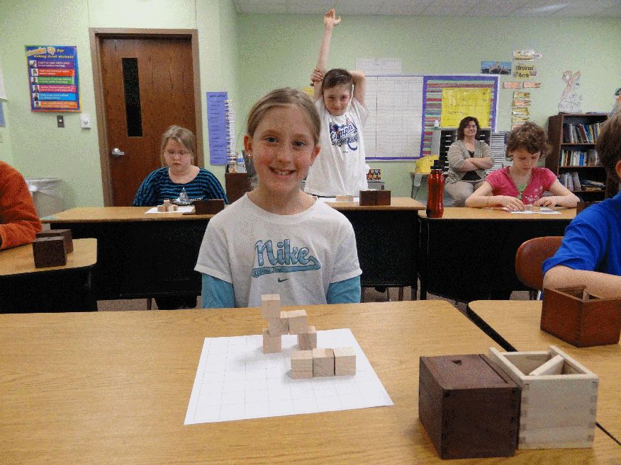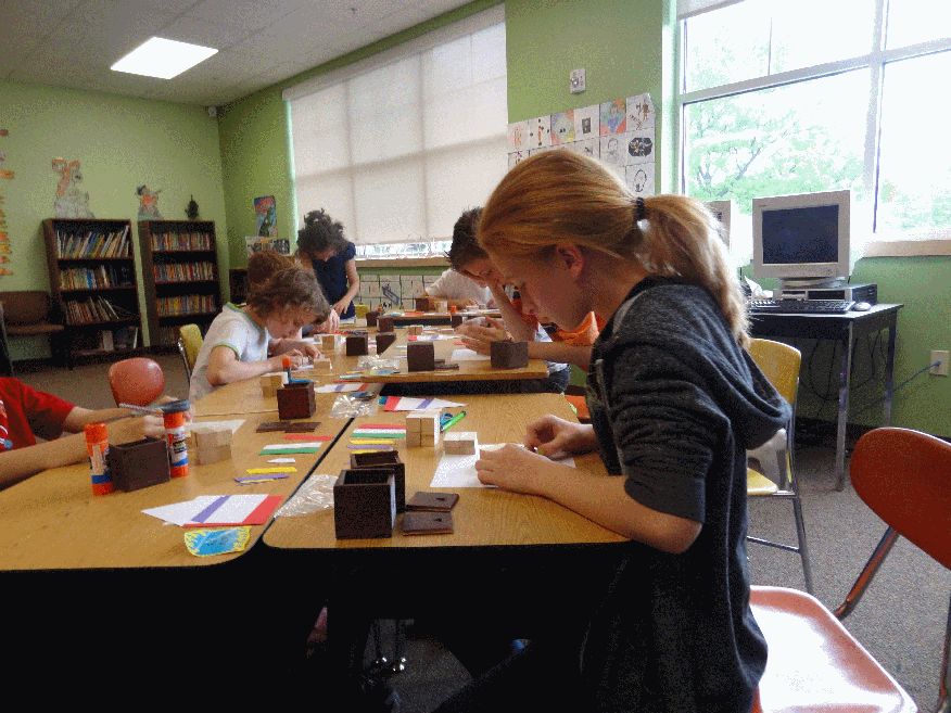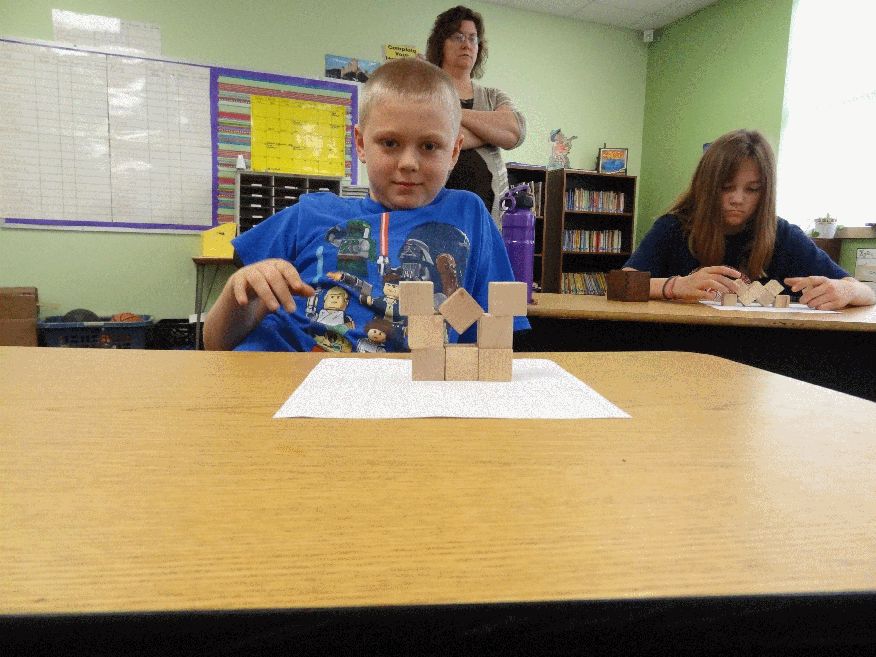 Fourth grade children, after being shown how, take time to play with individual sets of wood blocks.