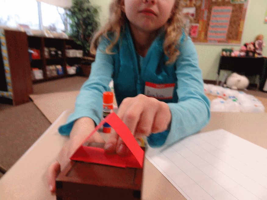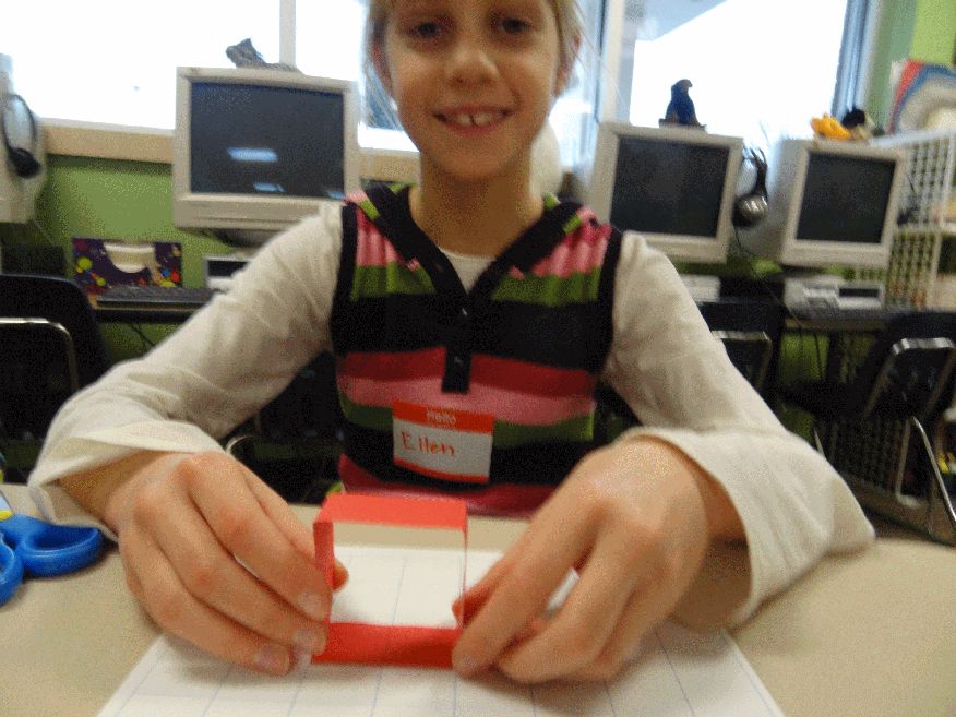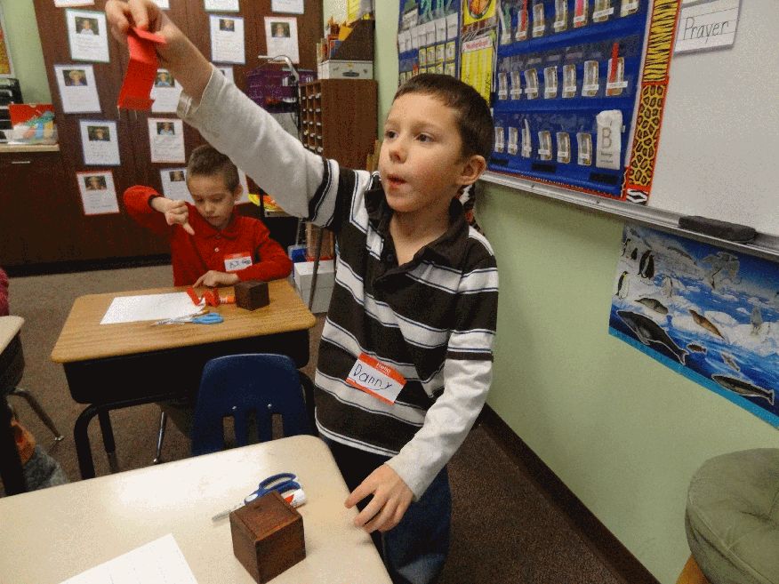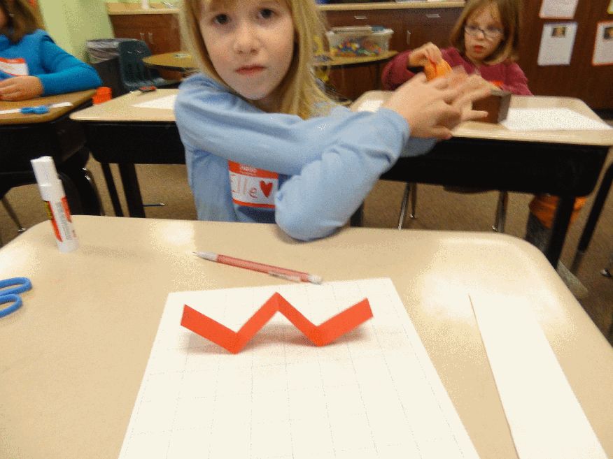 Second grade children playing with a 1 inch by 8 inch red paper strip.