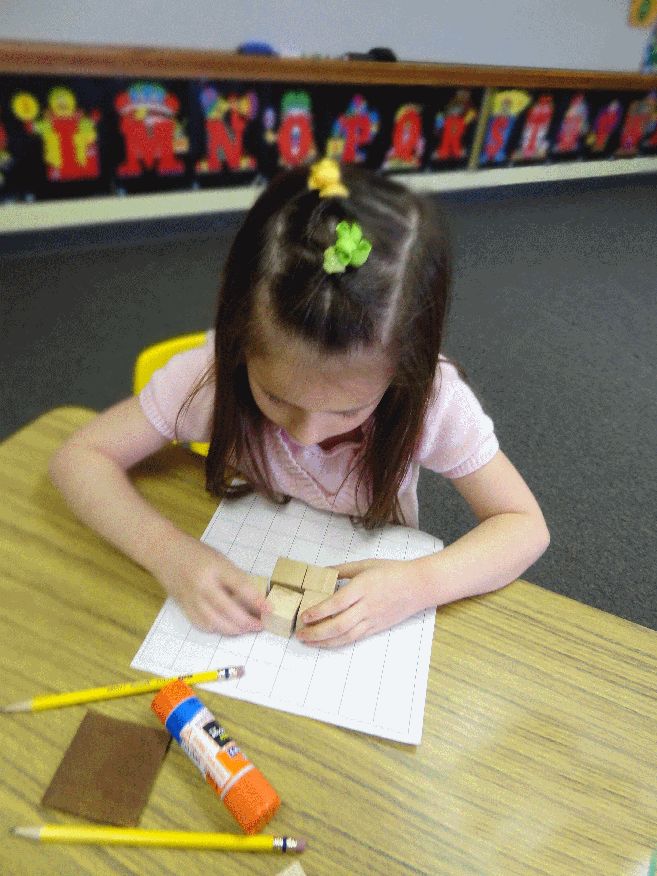 Kindergarten grade children play with and admire different block arrangements.
