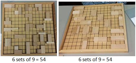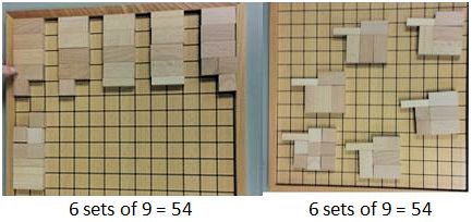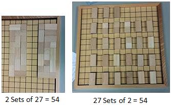 | She also noted, no slanted lines...only right angles. Laying all 36 pieces flat, the blocks cover 54 square inches on the Kindergarten Grid. She added, "Now we can play with the various ways to make factors of 54." Some of the combinations are shown here. |